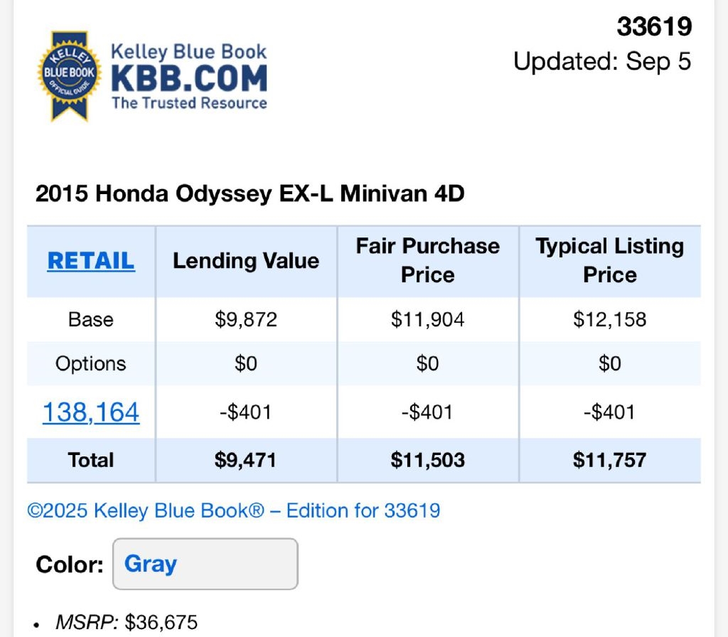 Hop into this sleek 2015 Honda Odyssey and get ready for an exciting ride! With its spacious interior, comfortable seating, and advanced safety features, this van is perfect for families on-the-go. The smooth gray exterior will turn heads as you cruise down the street, while the powerful engine will make every drive a thrilling experience. Whether you're heading to a soccer game, a weekend getaway, or just running errands around town, this Honda Odyssey will make sure you arrive in style and comfort. Plus, with its versatile storage options and convenient amenities, like the hands-free liftgate and rear entertainment system, every journey will feel like a breeze. Get ready to make memories in this reliable and luxurious van that's packed with all the features you need for a fun and enjoyable driving experience. Say goodbye to boring road trips and hello to endless adventures with this fantastic 2015 Honda Odyssey!